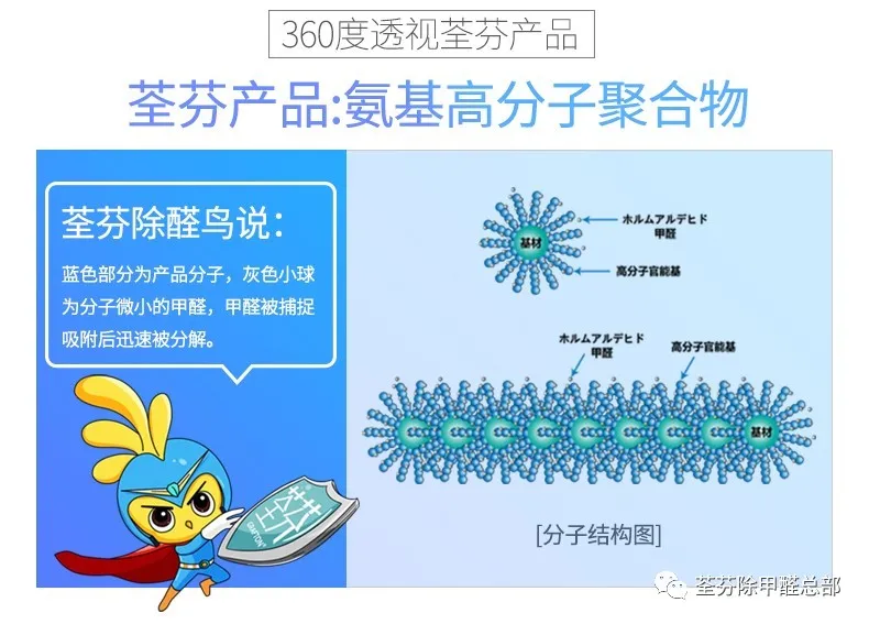 從短期除甲醛到長效除甲醛,而荃芬屬于氨基高分子聚合物除甲醛,產(chǎn)品主要和醛類物質(zhì)發(fā)生反應(yīng),會(huì)不斷吸附分解甲醛,從而達(dá)到降低甲醛濃度的目的。